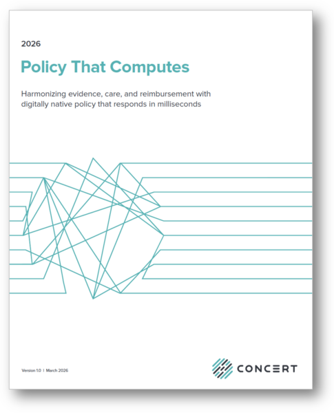 The development and administration of health plan clinical policy is often slow, manual, and error-prone. Concert has engineered a ground-up approach to develop digitally native policy that is structured for machine readability and maintained as a living data asset vetted by hundreds of clinical experts. These policies are deployed from the cloud to integrate into any clinical or reimbursement workflow.